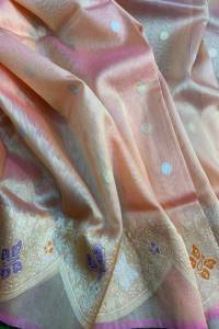 Rungkaat presents Tissue Silk Sarees which are made by merging pure silk threads with metal threads that give the saree a mild lustre and a sleek feel. The combination of these threads gives a saree a gentle shimmer that is very noticeable but not at all overpowering. Tissue Silk Sarees have been traditional attires known for their lovely combination of coziness and loveliness, and they make any event bright with their presence.