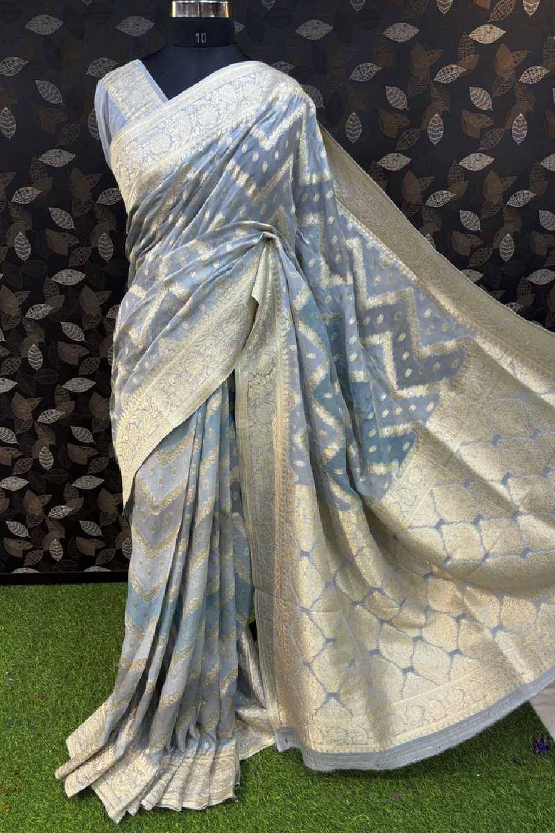 Rungkaat presents chiffon sarees that capture the beauty of effortless elegance. The airy, soft texture of chiffon makes these sarees a favorite among women who love comfort with sophistication. The material is draped very neatly, it gives a very nice shape to the body and keeps the person cool and elegant. Every collection is an embodiment of the subtleness that is in each Chiffon Saree in Varanasi which is adored by the people who put it on because it is an ideal mixture of delicacy and charm.