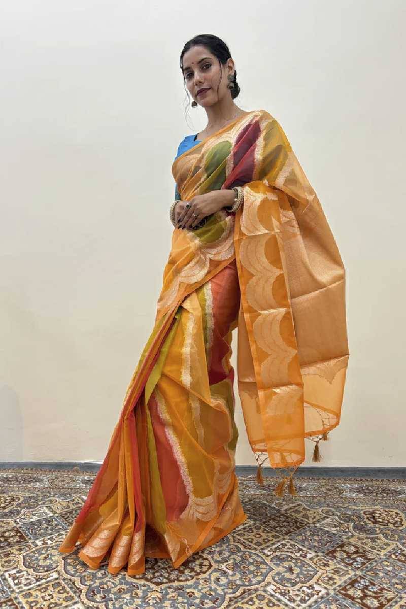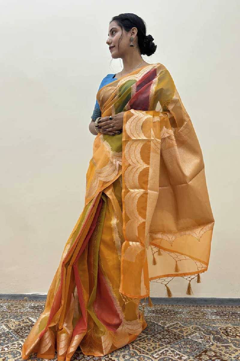 | Dual-Tone Elegance | The vibrant blend of orange and yellow adds a festive charm to your look. |