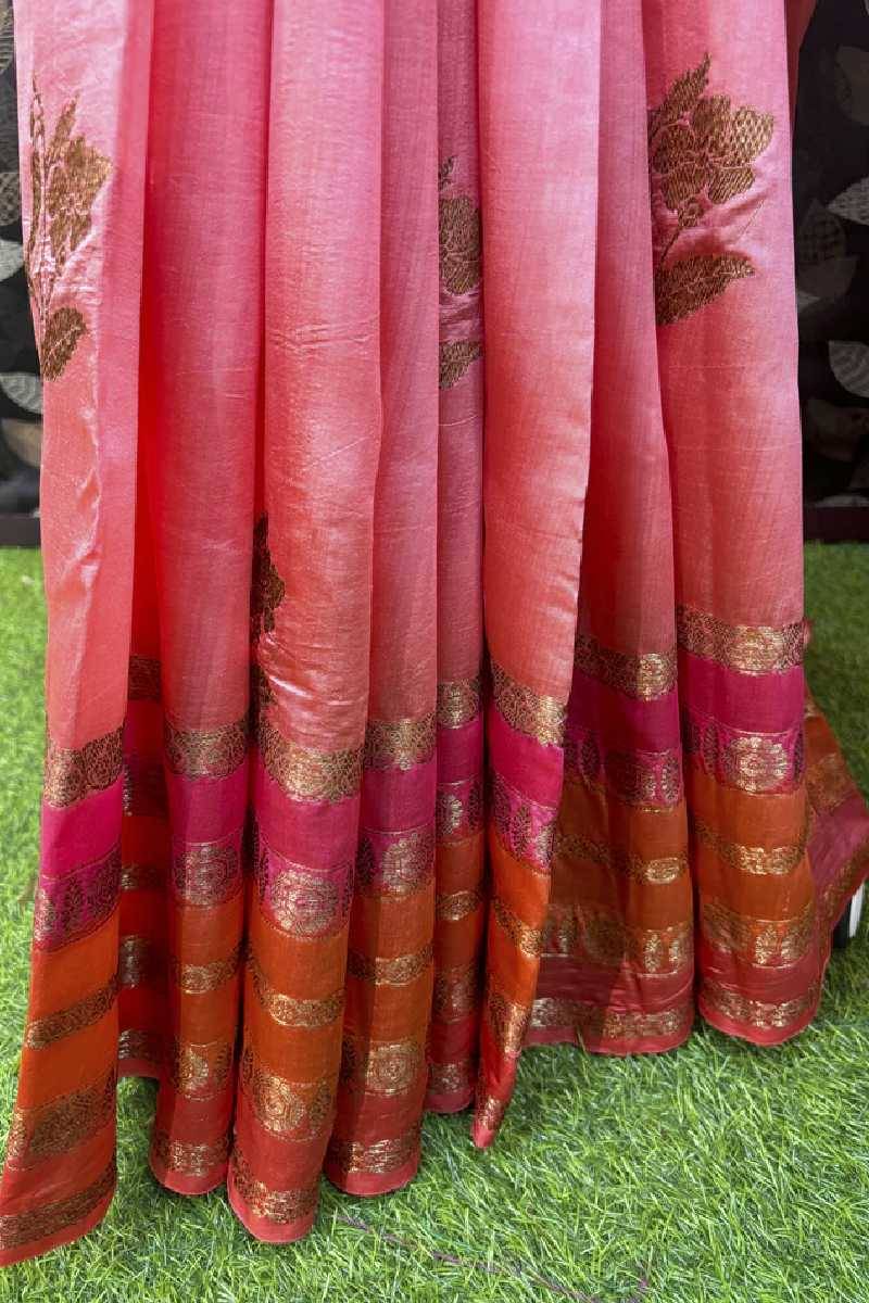 Rungkaat presents Tissue Silk Sarees which are made by merging pure silk threads with metal threads that give the saree a mild lustre and a sleek feel. The combination of these threads gives a saree a gentle shimmer that is very noticeable but not at all overpowering. Tissue Silk Sarees have been traditional attires known for their lovely combination of coziness and loveliness, and they make any event bright with their presence.