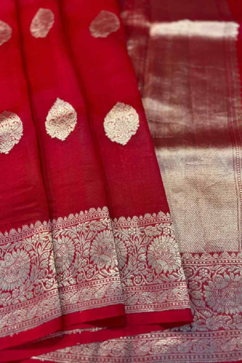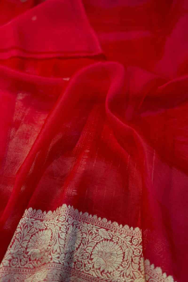 At Rungkaat, we have always held Kora silk with utmost purity and grace. The sheer texture, lightness, and natural stiffness of this silk give it an aura of dignity that is impossible to achieve by few fabrics. Therefore, Kora silk appears royal without being too heavy. The true value lies in its representation of fine craftsmanship, reflected in every intricate detail. Kora Silk Banarasi Sarees in Varanasi embody a rich legacy of tradition and elegance, with every thread reflecting the timeless artistry of the city.